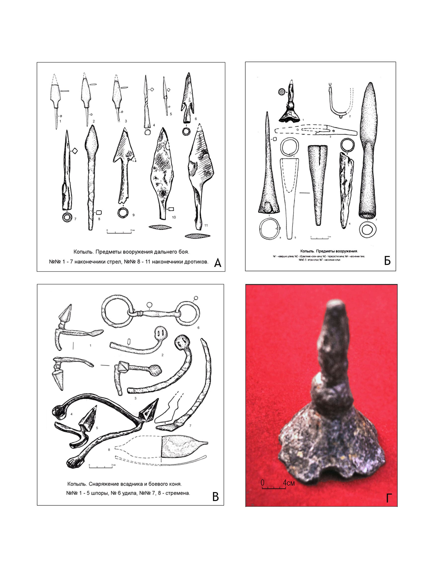 Историческое название Копыль. Современное название Копыль, районный центр Минской области, в 120 км юго-западнее Минска. Первое достоверное упоминание о нем содержится в Галицко-Волынской летописи и относится к 1274 г. в связи с походом луцкого князя Мстислава Даниловича, который дойдя до Копыля, пошел дальше воевать по Полесью: «Мьстиславлъ … же бешеть Копыль воюет по Полесью» [ПСРЛ, т. ІІ, ст. 873.]. По данным археологии поселение на месте будущего Копыля существовало уже в раннем железном веке. Одним из мест такого поселение было древнее городище и прилегающая к нему территория. Древнее городище Копыля находится в самом центре современного города. Оно возвышается на высоту 11 м над поймой р. Каменки. Среди местного населения известно под названием “Замковая гора”. Площадь городища 0,3– 0,35 га. В период средневековья и нового времени тут располагался детинец и Верхний замок Копыля. С юго-востока детинец древнего Копыля охватывает окольный город, а позже Нижний замок Копыля. За ним располагался городской курганный некрополь. Памятник обследовался в 1966 г. В. В. Седовым и П. Ф. Лысенко, в 1979 г. и в 19858 г. М.Ф. Гуриным. Археологические раскопки проводились Л.В. Колединским в 1996– 1999, 2005 и 2007 гг. Изучались площадка детинца, вал и ров этого памятника, а также площадка, вал и ров окольного города, курганы в самом Копыле (городской некополь) и его округе. Вскрытая за все годы раскопок площадь составляет 675 кв. м. Курганов в черте города раскопано четыре. Коллекция индивидуальных находок насчитывает 1042 единицы. Материалы исследований позволяют выделить четыре этапа в развитии топографии и становлении материальной культуры Копыля периода средневековья и Нового времени.